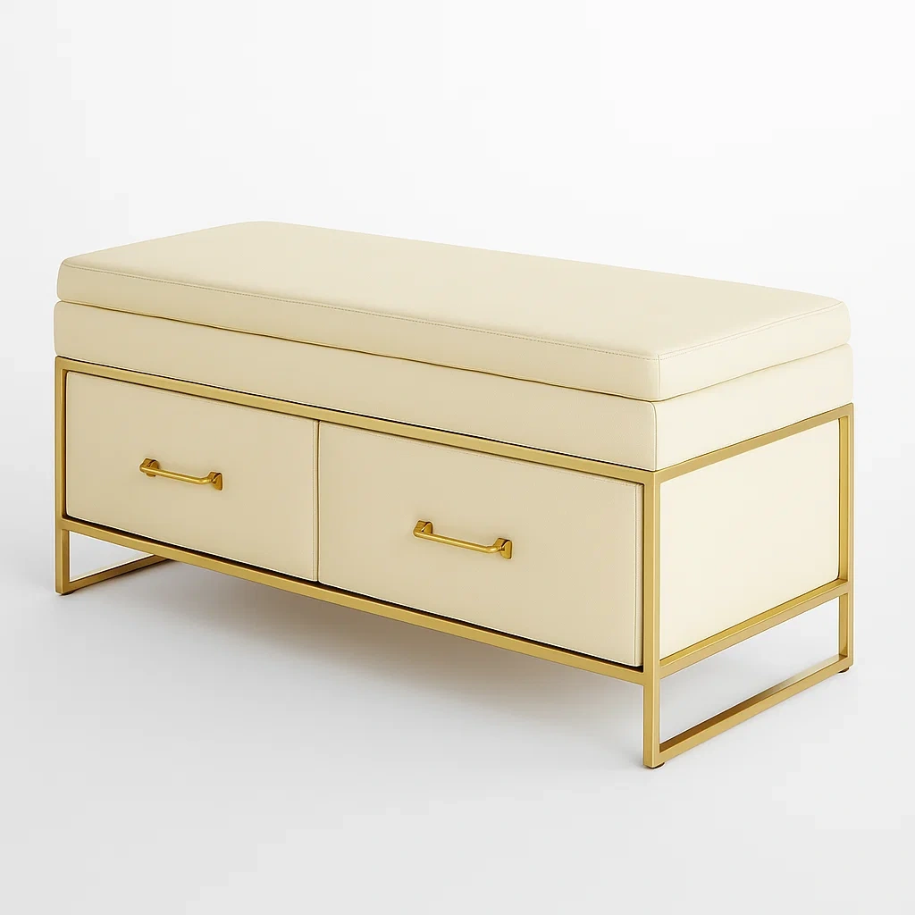 Panca contenitore in metallo e pu con cassetti avorio