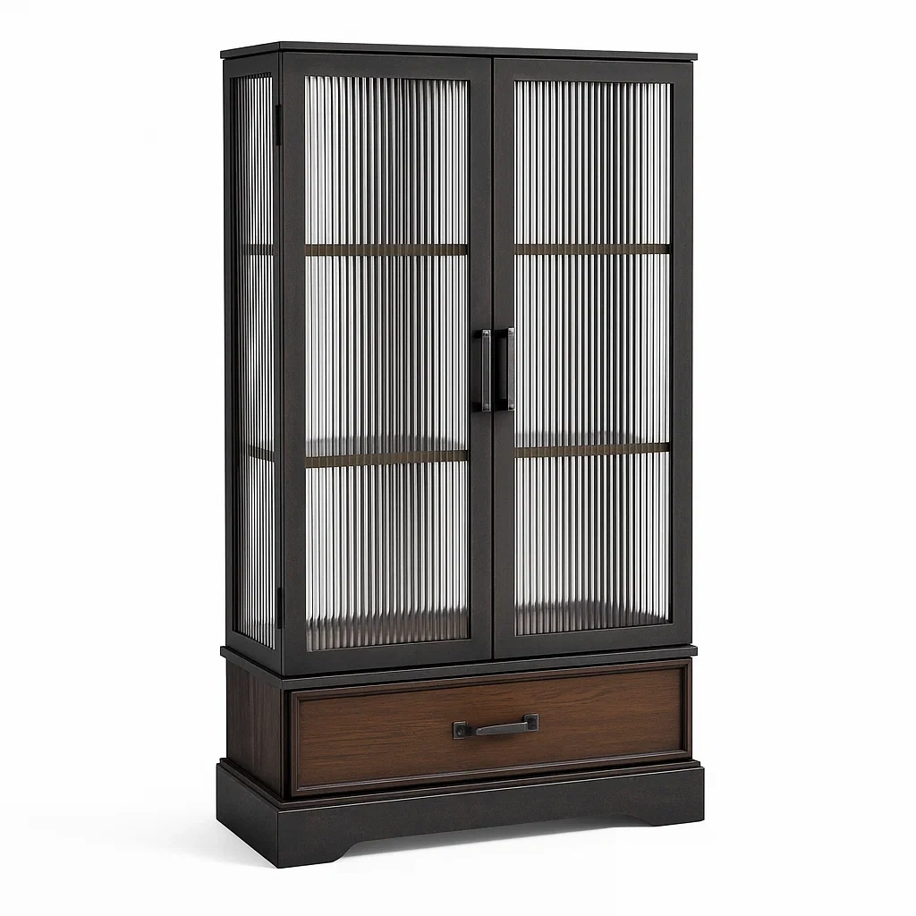 Vetrina in vetro temperato e acciaio con cassetto in legno 180x80x40 cm